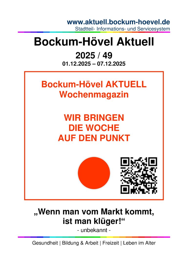 ![]() Bockum-Hövel AKTUELLWählen Sie zwischen 4 Darstellungsmöglichkeiten 1. SMARTPHONE - ANZEIGE (diese Seite zum einfachen Scrollen) 2. FLIP-BOOK - ANZEIGE (Blätterkatalog für PC/Notebook) 3. PDF - DOWNLOAD (Zur Anzeige in Ihrem PDF Programm) Option 3. und 4. ermöglichen das Anklicken von Links im Dokument!